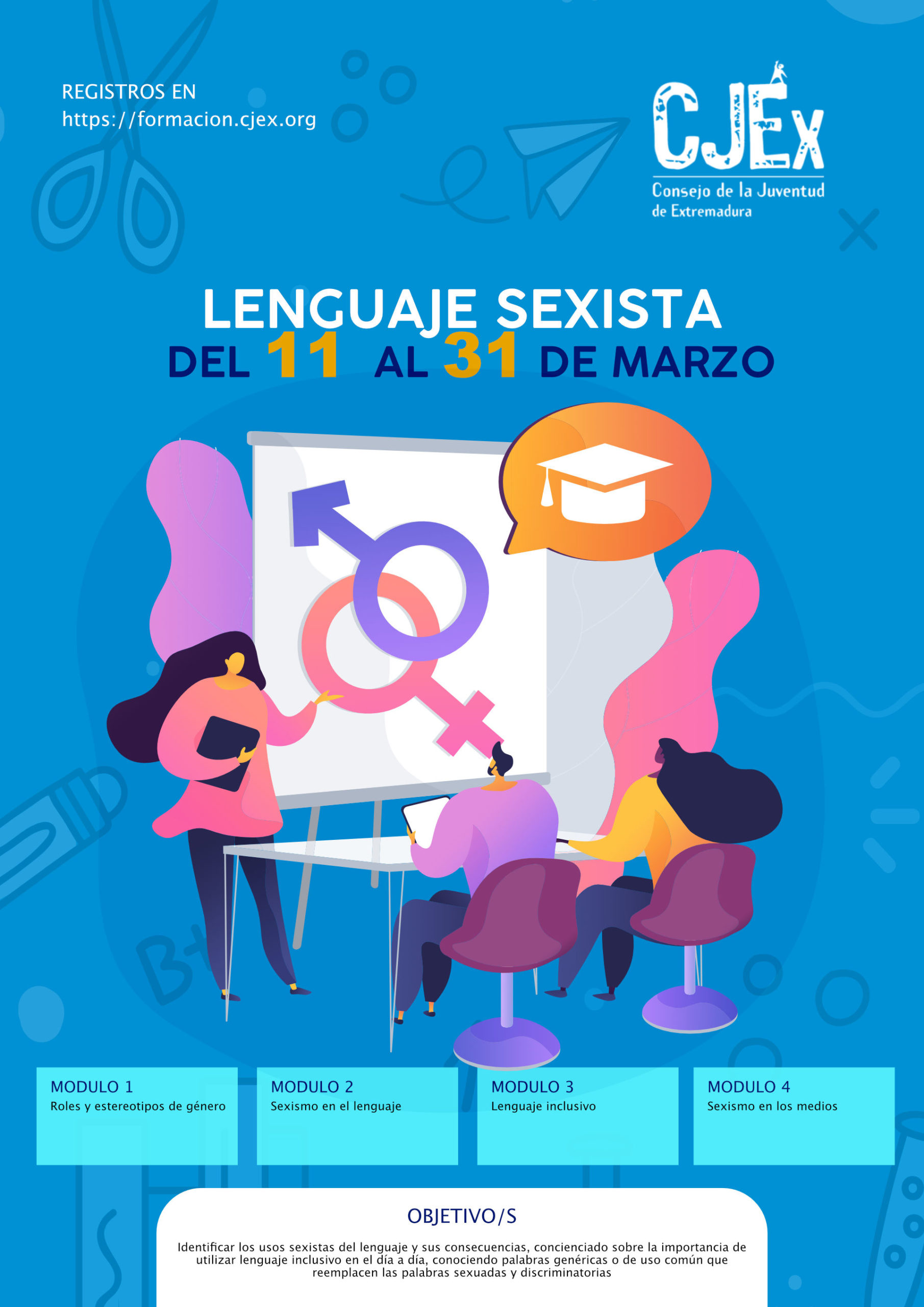 Te presentamos la nueva acción formativa online que hemos preparado en el Consejo de la Juventud de Extremadura para este mes de junio. Se trata de un curso sobre LENGUAJE SEXISTA, donde