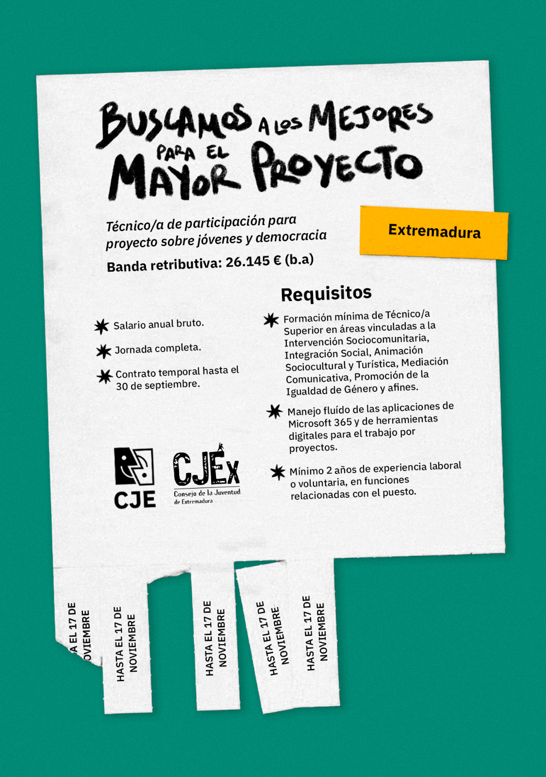 Favorecerás el fortalecimiento del tejido participativo juvenil en el territorio, mediante el apoyo técnico al Consejo de la Juventud de Extremadura, la dinamización de procesos participativos y el impulso de